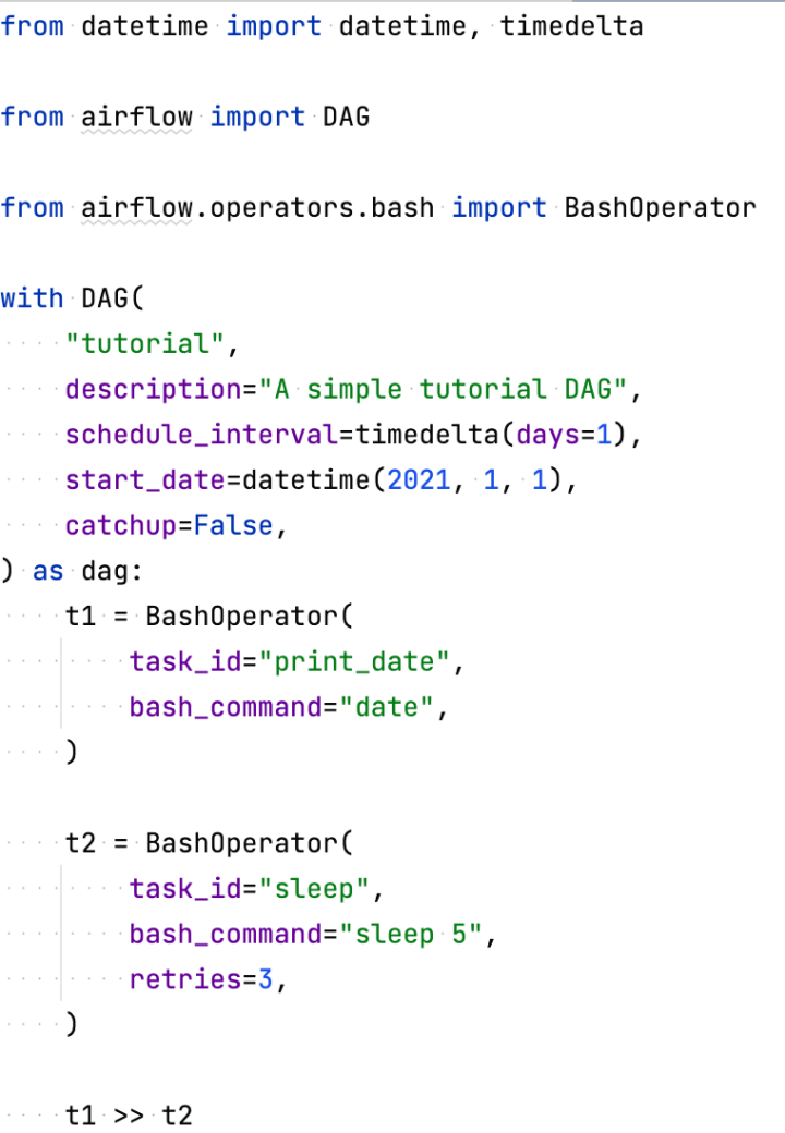 将 airflow.DAG 转换成 pydolphinscheduler.core.process_definition.ProcessDefinition,这个规则在第三行(import语句)以及第六行 DAG context 将 airflow.operators.bash.BashOperator 转换成 pydolphinscheduler.tasks.shell.Shell,这个规则在任务 t1,t2 中都被使用 除了对应的类转化之外,我们需要将类的属性进行转化,如将 airflow.DAG.schedule_interval 转换成了 ProcessDefinition.schedule,同时修改了部分值的内容,如将 timedelta(days=1) 转成 '0 0 0 * * ? *'