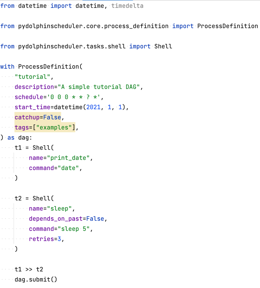 dolphinscheduler python sdk: 同 Airflow 类似,将全部工作流相关的信息都通过 Python 文件定义,但是 dolphinscheduler python sdk 是通过人为主动触发的方式,将工作流信息提交,运行命令 python 工作流文件名 即可完成主动任务提交。