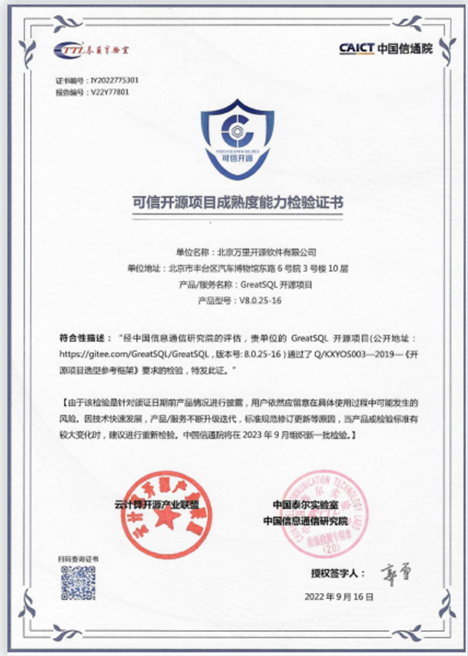 2021年,万里数据库主导成立了开源数据库社区GreatSQL社区,以建设国内MySQL技术生态为初衷,在提升MGR可靠性及性能、支持InnoDB并行查询等方面作出了大幅提升改进。于2022年9月通过了中国信通院评测的“可信开源项目成熟度能力检验”,社区及开源项目整体成熟度能力受到业内权威机构认定。