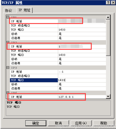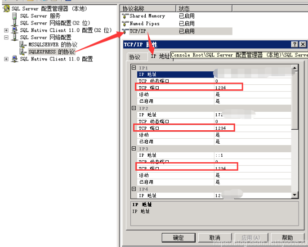 所以我就找到下面的SqlExpress,把tcp/ip里面的端口,调了一遍,改为1234.