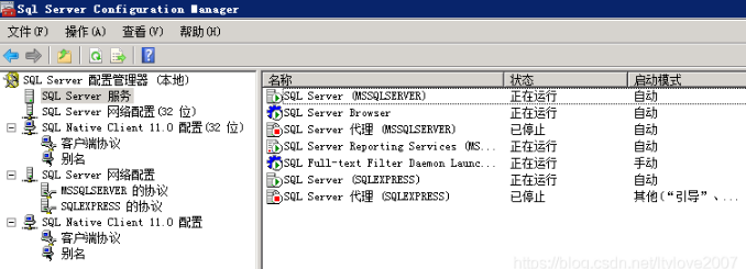找到MSSQLSERVER这个网络配置,看是否启动没,很显然是启动的,因为我服务器上面的Navicat能够链接成功。