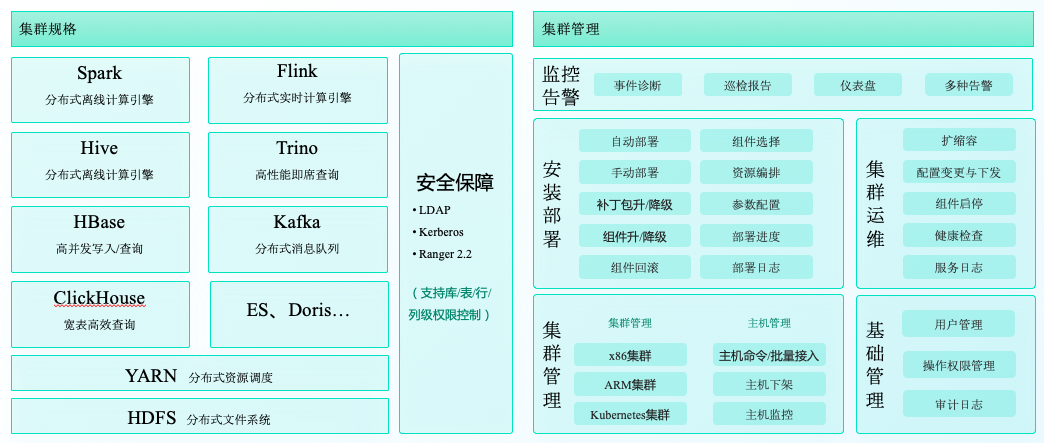 袋鼠云数栈自研的大数据基础平台「EasyMR」,是基于Hadoop、Hive、Spark、Flink、HBase、Kafka、Trino等开源组件,构建的弹性计算引擎,提供安全可靠、弹性伸缩、低成本的大数据存储与计算服务。