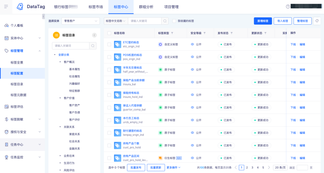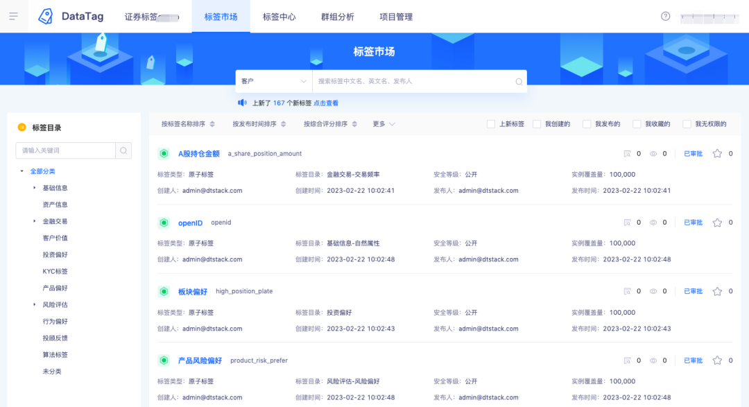 · 客户数据洞察平台DataTag:通过标签萃取、标签管理、标签圈群、群组分析、全面画像,构建以业务价值为导向的标签体系和多样化群组,应用于企业智能化运营与营销;