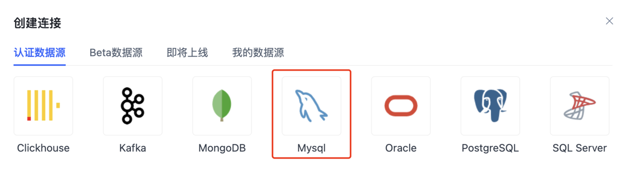 在 Tapdata Cloud 连接管理菜单栏,点击【创建连接】按钮, 在弹出的窗口中选择 MySQL 数据库,并点击确定。