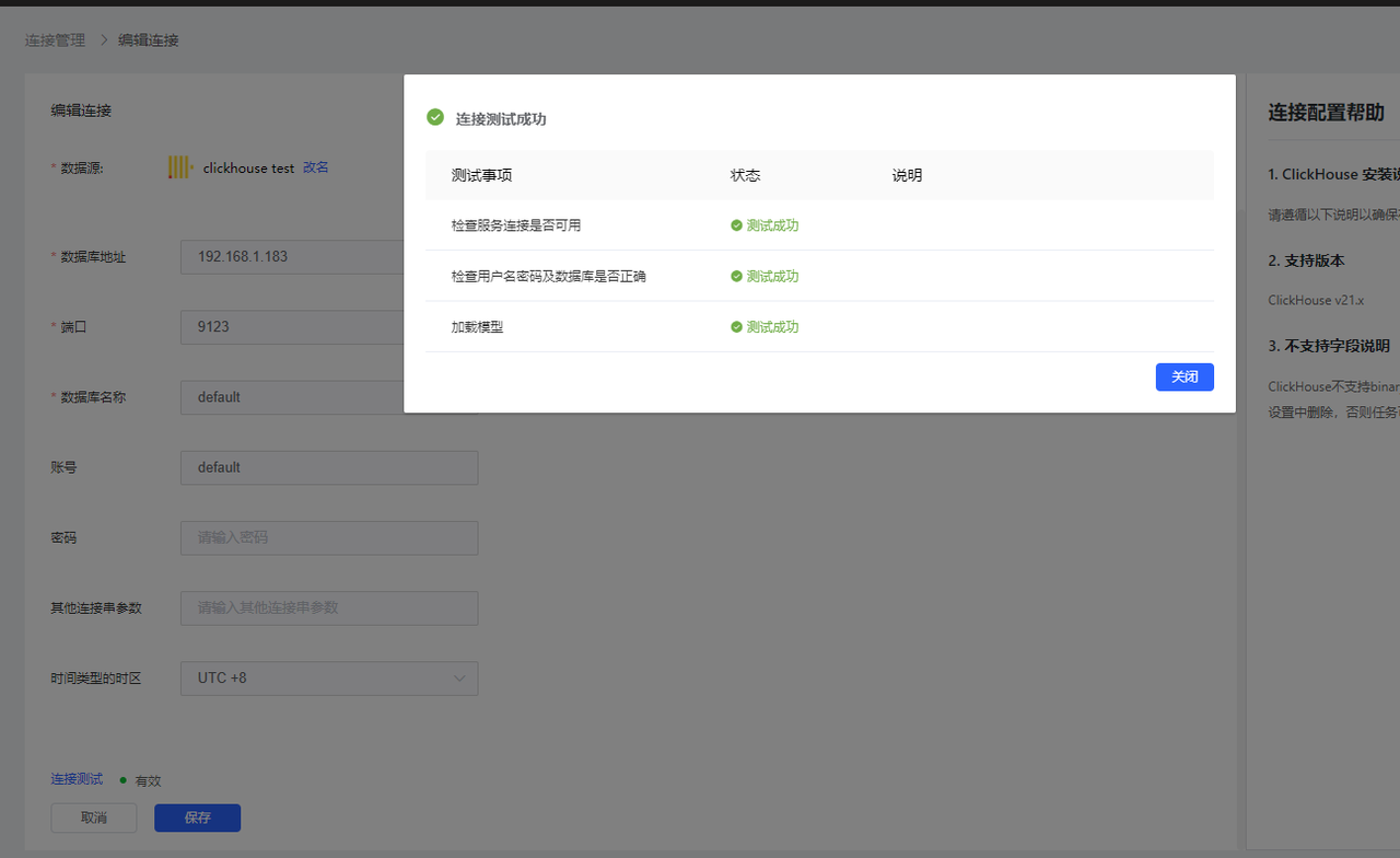 单击连接测试,提示测试通过后单击保存。(*如提示连接测试失败,可根据页面提示进行修复)