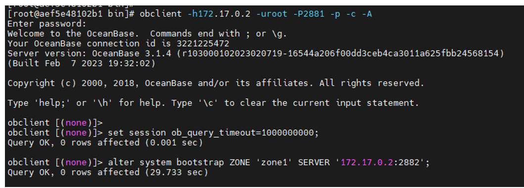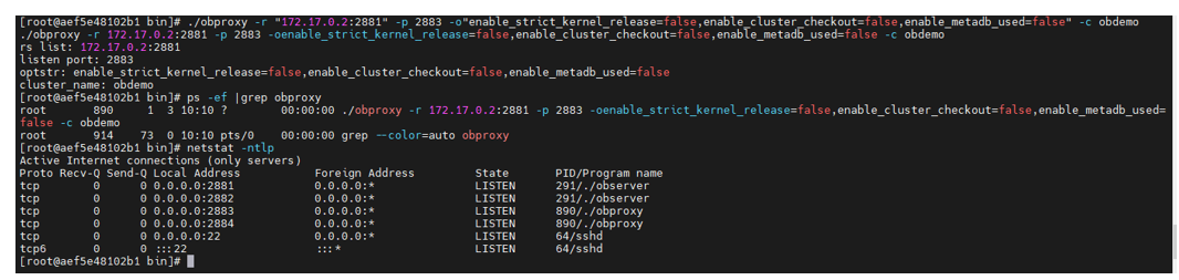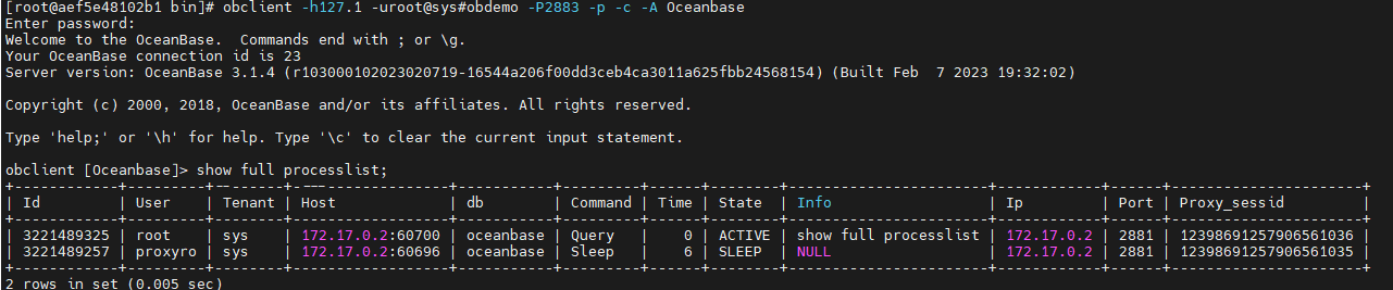[root@aef5e48102b1 bin]# obclient -h172.17.0.2 -uroot@proxysys -P2883 -p –-proxy-mode