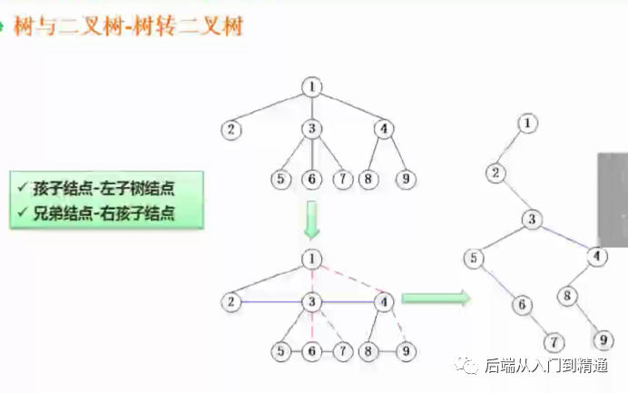 树转二叉树:孩子结点-左子树结点;兄弟结点-右孩子节点。