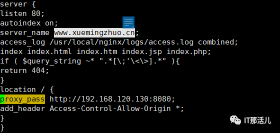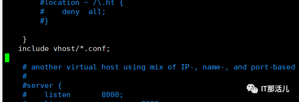 --192.168.120.130:客户端(内网服务器)--CentOS-7-x86_64-Minimal-1810.iso2.1 找到nginx的.conf配置文件的所在地使用cd usr/local/nginx/conf命令找到nginx.conf配置文件使用vim命令编辑nginx.conf文件。在nginx安装目录conf目录项目新建一个vhost目录,然后在vhost目录下新建配置文件文件名需要以.conf来结尾。2.3 使用vim配置vhost里面的.conf配置文件使用:wq保存。