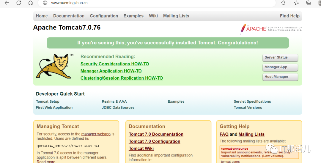 --access_log用来指定日至文件的路径及使用的何种日志格式记录日志。2.4 在conf里面配置nginx.conf的配置在http的节点上配置include vhost/*.conf路径信息。2.5 使用nginx -t查看nginx配置是否正常2.6 使用nginx -s reload来重新启动nginx命令2.7 在本地浏览器输入www.xuemingzhuo.cn来反向代理tomcat主页操作过程中遇到的问题FAQ: