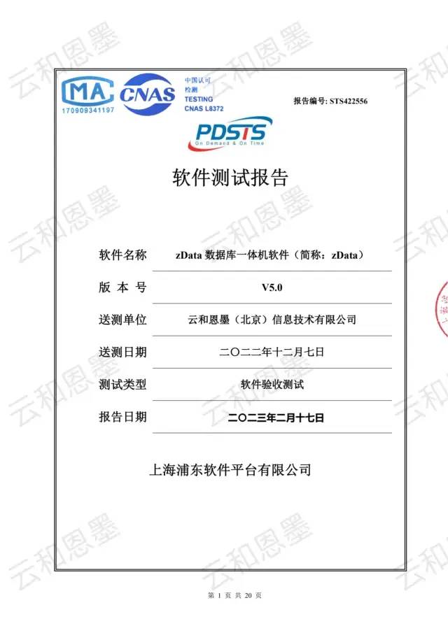 近日,云和恩墨 zCloud 数据库云管平台及 zData 数据库一体机通过CMA&CNAS双重认证的第三方软件测试机构权威认可,并获得软件验收测试报告。