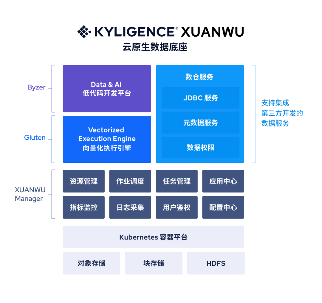 玄武(XUANWU)包含低代码开发平台白泽(Byzer)、向量化执行引擎 Gluten、资源和服务管理控制台 XUANWU Manager 三大模块,具备以下能力与优势: