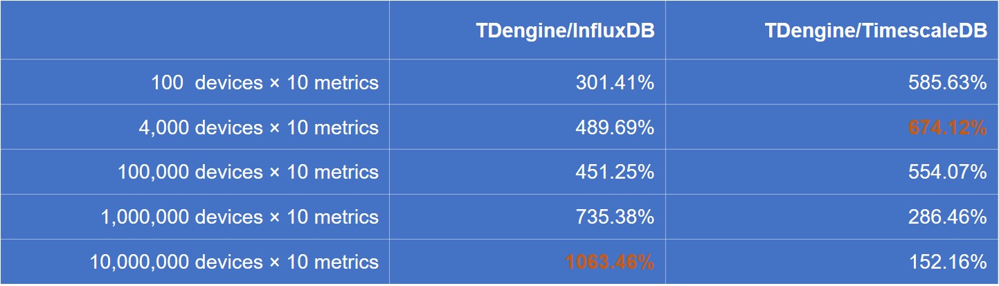 下面可以简单为大家介绍下本次测试结果。如下表所示,在全部五个场景中,TDengine 写入性能均优于 InfluxDB 和 TimescaleDB,写入过程中资源占用最低。对比 InfluxDB,TDengine 写入最优的场景是在 1000 万设备下,达到了 InfluxDB 的 10.6 倍;对比 TimescaleDB ,TDengine 写入最优的场景是在 4000 个设备下,达到了 TimeScaleDB 的 6.7 倍。