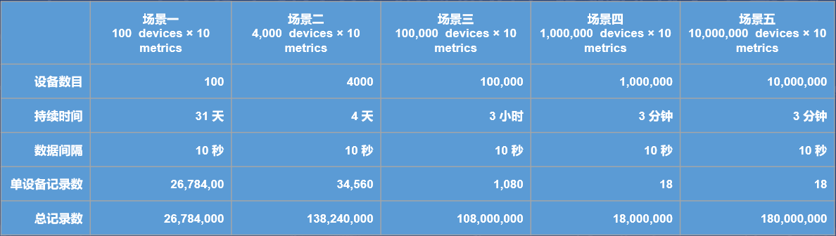 TSBS 测试可以简单划分为两个主要部分——数据写入和数据查询。在本次整个基准性能评估中,共涉及以下五个场景,每个场景的具体数据规模和特点见下表: