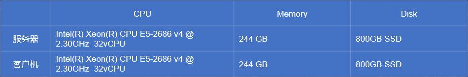 为了保证测试结果的公正可靠及可复制性,我们选用了公共 IaaS 平台来搭建 Benchmark 基础硬件环境,采用了大多数性能对比报告中使用的场景——亚马逊 EC2 服务环境下 r4.8xlarge 类型的实例作为基础运行平台,区域为北美地区,包括 1 台服务器、1 台客户端。客户端与服务器硬件配置完全相同,两者使用 10 Gbps 网络连接。配置简表如下: