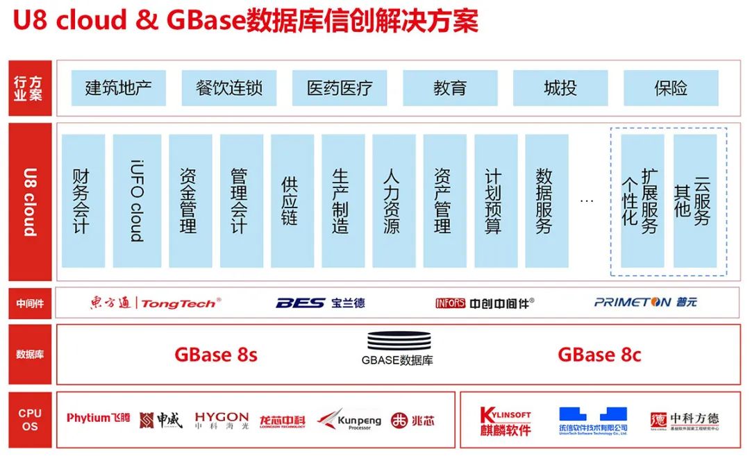 用友U8 cloud全栈适配信创产业链,与GBASE南大通用在内的信创厂商密切合作,通过安全可控、自主创新的体系建设,携手构建了面向成长型集团企业的一体化全技术栈信创企业管理解决方案,让企业信息安全可控。