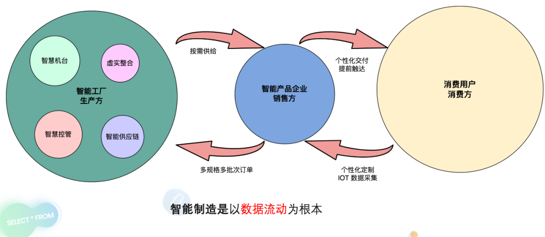 在工业 4.0 时代,需要智能工厂、销售企业和消费者多方协同配合来满足市场需求。其中,对于高端制造企业而言,整个智慧工厂要用数字化、系统化和自动化来取代人工流水线操作,通过更加科学合理的生产流程、更加精准的加工工艺以及智能供应链保证持续稳定的产能,提供单条产线加工多种产品的能力来降低整体生产成本。企业销售侧,则需对产品使用过程中上报的数据和用户行为、用户反馈等数据进行收集、加工和分析,来对产品进行升级迭代、更好优化用户体验、提升用户黏性,同时也能更准确预估市场需求,帮助企业做出合理的经营策略。