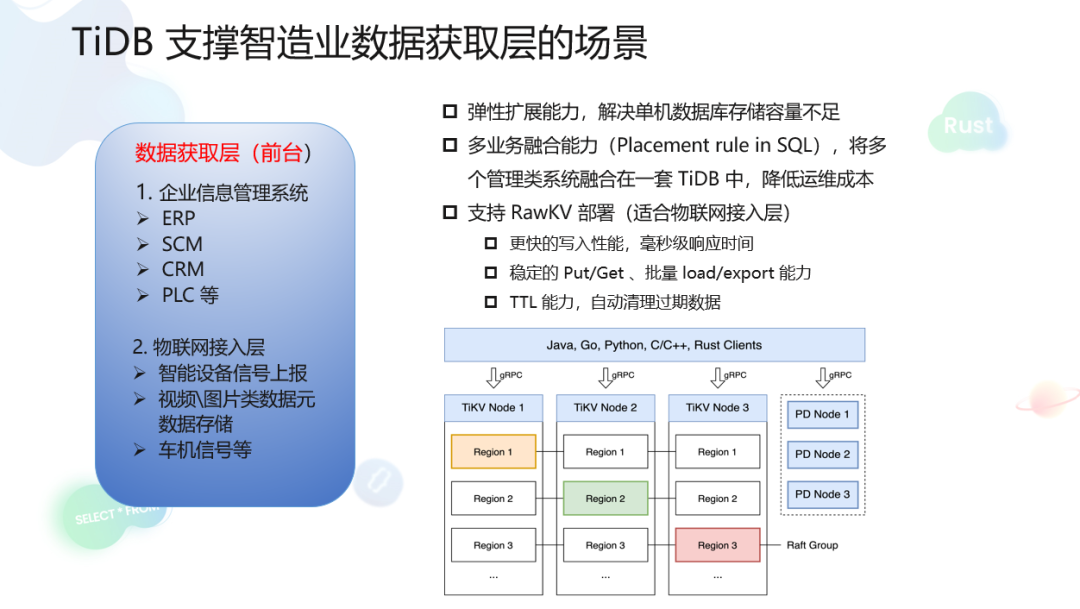 此外,TiKV 可以独立于 TiDB,与 PD 构成 KV 数据库(此时产品形态为 RawKV)。RawKV 可以绕过事务处理层,提供更高的写入性能和更短的 Latency,具备 Time-To-Live 功能,自动清理不需要长期存储的数据。相较于 TiDB 部署形态, RawKV 更加适合高频写入的物联网接入层场景,比如用于存储物联设备上报的信号数据。
