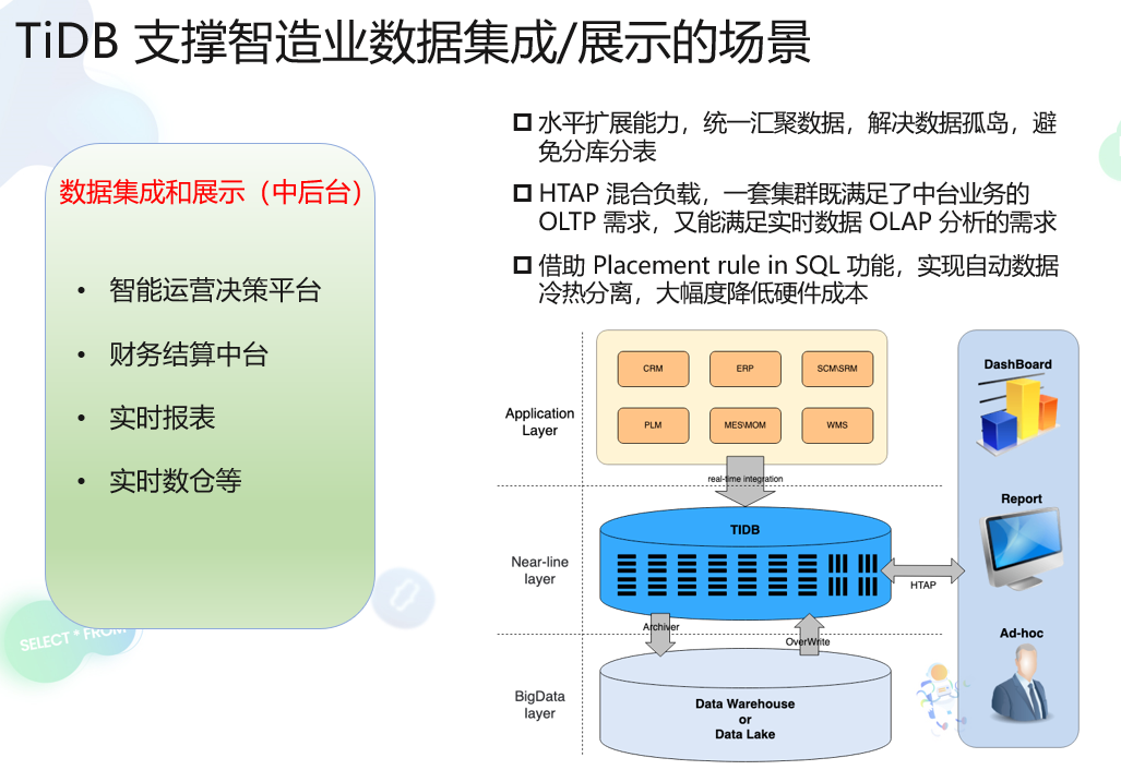 在数据集成和应用层面,智能制造企业同样可以运用 TiDB 灵活的水平扩展能力,通过将多源数据统一汇聚,打破数据壁垒,解决数据孤岛问题,为智造企业提供融合统一的数据中台底座(比如实时数仓、财务中台等)。同时借助 TiDB 的实时分析能力,帮助企业更加快速准确地在工厂智造、产品营销等方面做出经营决策。