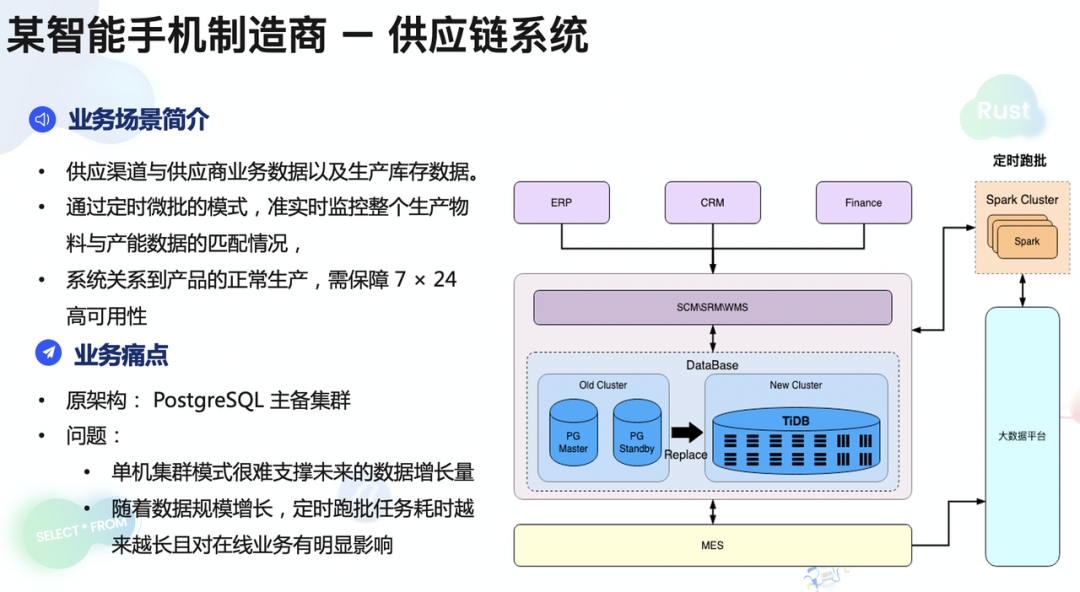 该智能手机制造商会通过定时微批的模式实时监控整个产品生产物料和产能数据的匹配情况,由于系统和整体产线高度关联,该供应链系统需要保证 7×24 可用。最初该智能手机制造商采用的数据库架构是 PG 集群主备模式,但很快就遇到两个问题:1、单机集群模式很难支撑未来的数据增长;2、随着数据的增长,定时跑批任务耗时越来越长,让业务方难以忍受,同时会对集群内的在线业务有明显影响。