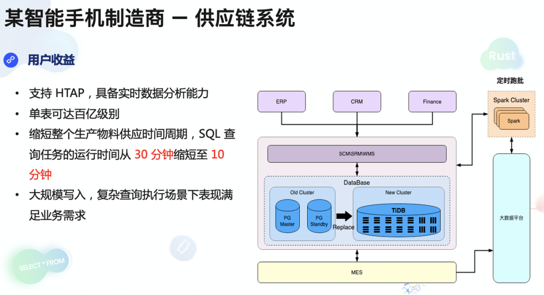 目前,该制智能手机造商使用 TiDB 整体替换了原来的 PG 主备架构,在业务上获得以下收益: