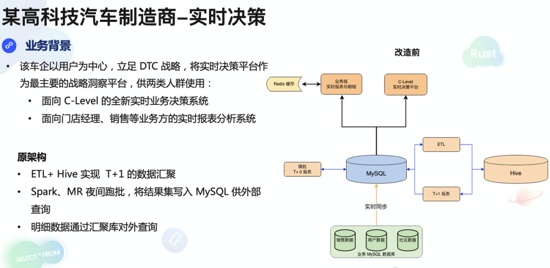 该车企原架构采用 ETL+Hive 实现 T+1 数据汇聚,再通过 Spark 、MR 夜间跑批,将结果写入 MySQL 供外部查询,明细数据会通过汇聚库来对外提供查询。原架构在改造前面临着如下痛点:1、整体技术架构复杂,运维开发成本高;2、原有汇聚数据库已经无法承载日益增长的数据量;3、明细数据和报表数据存在时间差,数据的准确性很难得到保证。