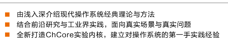 除纸质版教材外,本书还配有网络章节、在线社区和课程实验。与本书配套的微内核架构教学操作系统ChCore由上海交通大学并行与分布式系统研究所设计并实现,通过ChCore相关实验,读者可在动手实践中获得第一手经验。