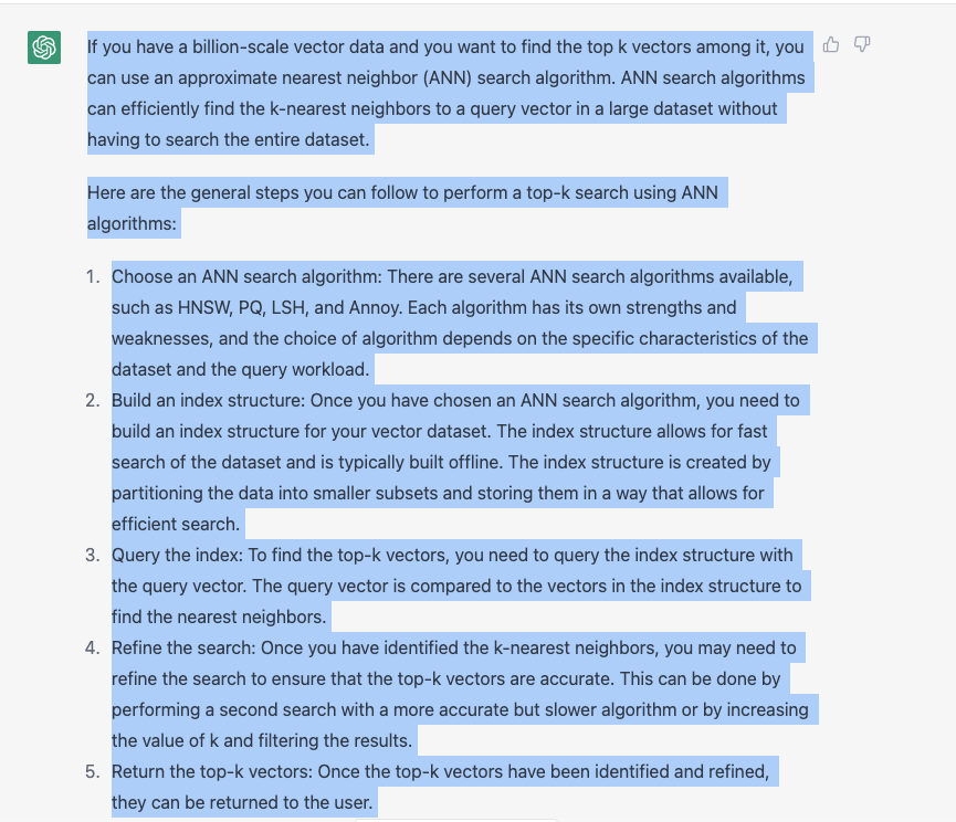 我尝试着使用 ChatGPT 回答过去一个月搜索过的 30 个问题,ChatGPT 提供的结果大概有 60% 在体感上优于 Google Search。当我询问“如何从十亿规模的向量数据找到最详细的结果”时,Google 给出的回答是一些向量检索库和向量数据库的软文链接,而 ChatGPT 则秀出了一段相当惊艳的回答: