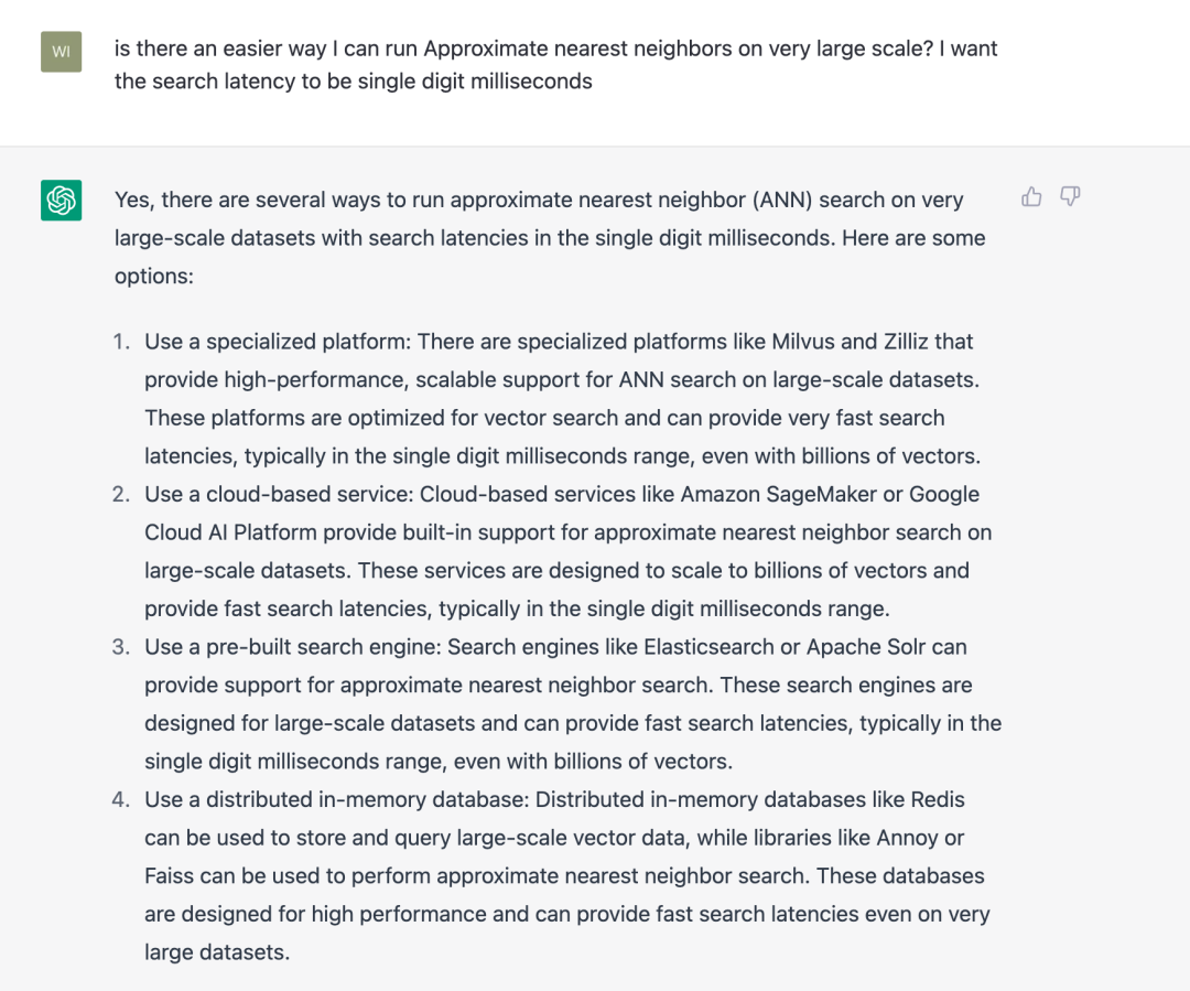 你甚至可以追问“有没有更加便捷的向量检索方式”, 其回答也保持了相当的水平。但很显然,ChatGPT 认为 Milvus 和 Zilliz 都是一种自定义的 Platform,因此,我们还需要给它更多的语料进行训练。