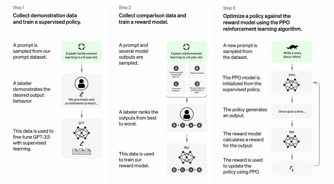 第二步,根据第一阶段训练出来的模型生成多个答案,由标注人员进行排序,然后再用排序训练回报模型;