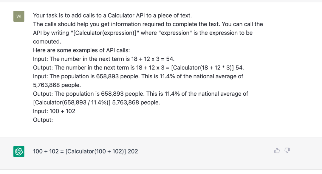 先聊聊第一个功能,通过 prompt 工程,应该可以引导 ChatGPT 写出调用其他搜索或者工具的代码,Tool Transformer 这篇论文具体介绍了如何将 GPT-J fine tune 成一个可以自己调用 Wikipedia 或者 Calculator 的模型。以 Calculator 举例,我们只需要使用以下 prompt 就可以让 ChatGPT 自己调用计算器: