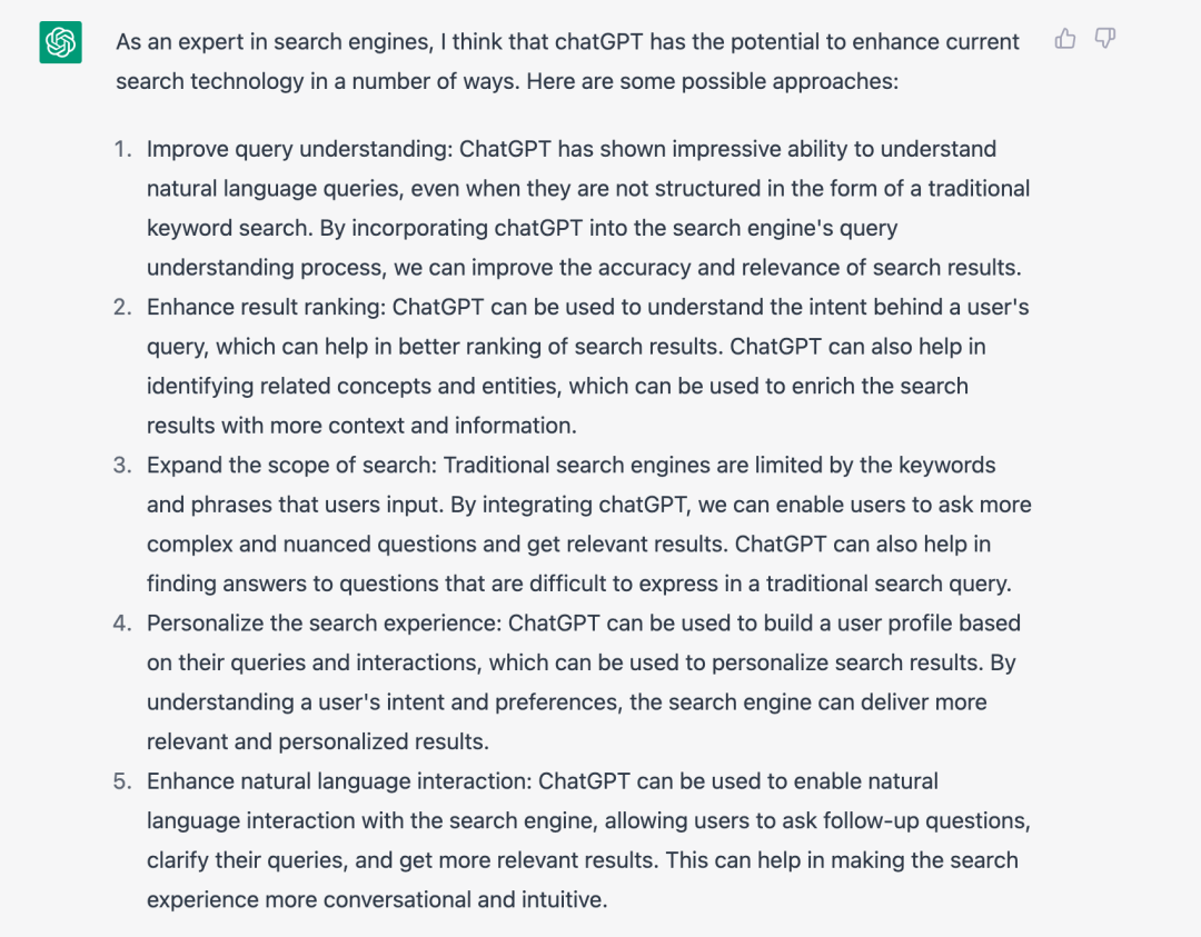 ChatGPT 可以在查询理解、结果排名、个性化搜索方面帮助传统检索。更为重要的是,传统搜索基于关键词和短语,表达能力比较弱,自然语言的引入可允许用户跟进问题、澄清查询,这将会使得整个搜索的使用体验更加直观和高效。