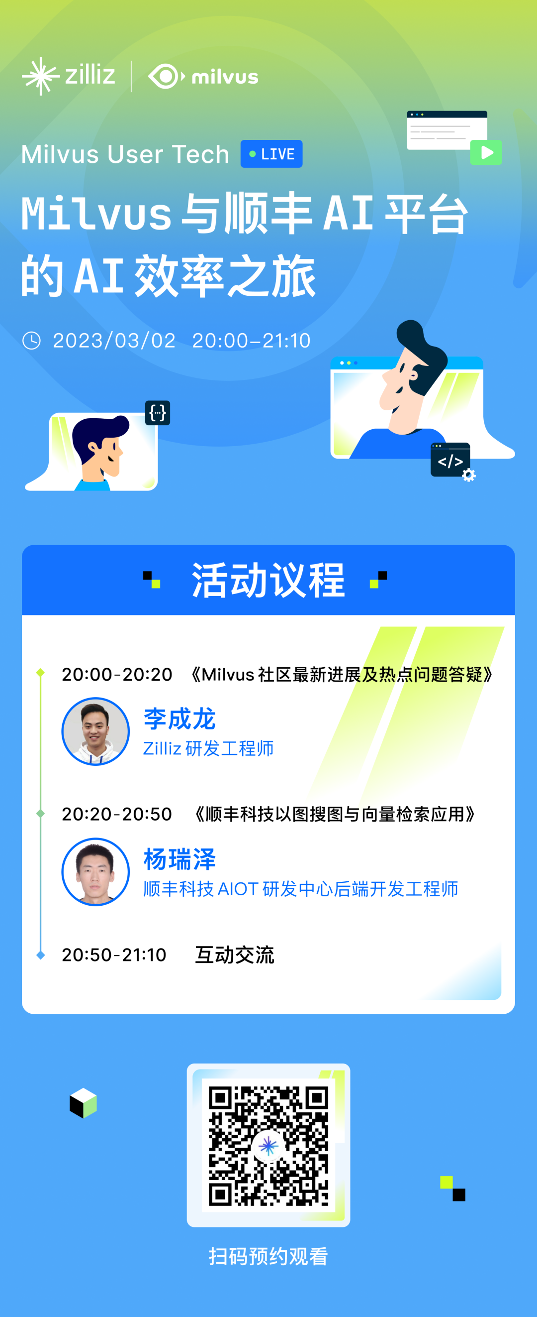 为了更好地让大家了解 Milvus 在 AI 领域场景的实际应用,2023 年的第一场线上直播,我们特意邀请到了顺丰科技 AIOT 研发中心的工程师杨瑞泽老师。他将通过顺丰 AI 平台在以图搜图场景中向量检索的实际经验,拆解在处理数据大调用量和高并发问题时,如何快速提升搜索效率。