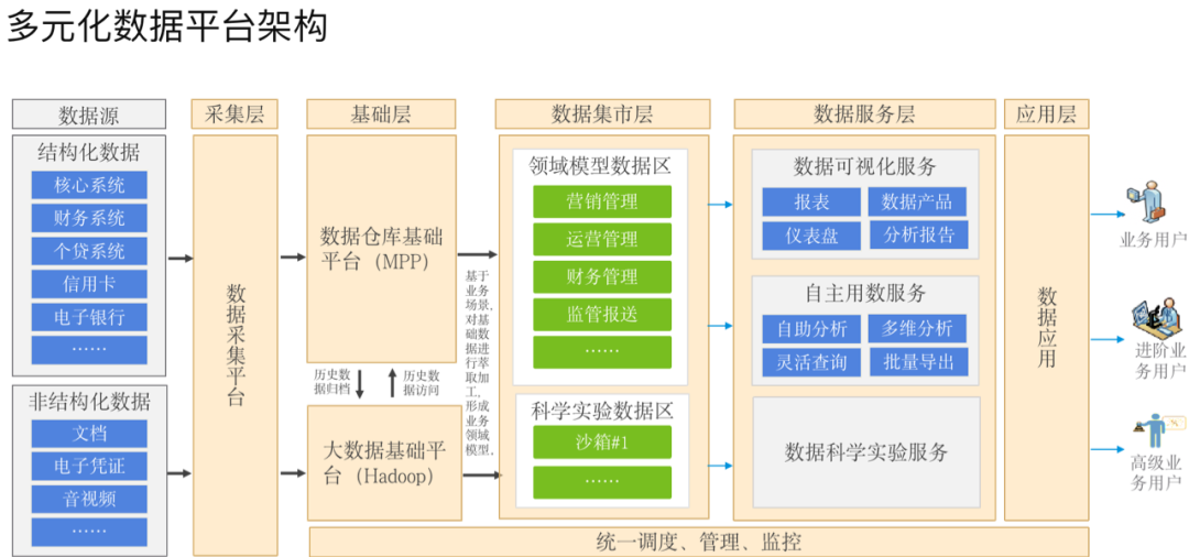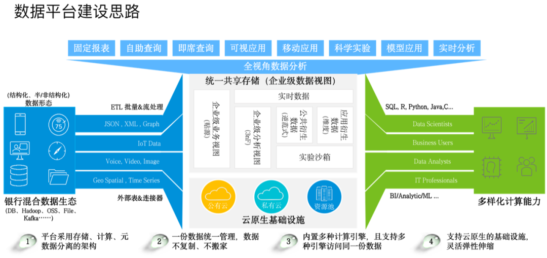 当前,数据成为驱动银行业数字化转型的关键生产要素。如何从海量的数据中识别有效的价值数据,实现业务与数据的深度融合,激活数据要素潜能、深挖数据资产价值,成为银行业持续探索的重要课题。随着云计算、大数据等技术的发展,银行业对数据分析的需求也从面向过去的描述型分析,逐渐演变成面向过去、未来和现在的全视角、智能化分析。作为分析的数据源头,数据库是保障分析事务稳定、高效执行的关键基础设施。在近期的直播中,我们从数据分析的视角介绍了银行业数据平台演进过程和实现方式,论述数据平台如何通过架构演进升级,帮助银行业最大限度释放数据资源价值。相比其他行业,数据资产对于银行业而言尤为重要。在央行发布的《金融科技发展规划(2022-2025)》中,明确提出“激活金融数据要素潜能”“加强数据能力建设”“夯实金融创新发展数字底座”,加速金融科技创新发展中数据基础设施建设升级势在必行。近年来,随着ICT技术的发展,银行业正从流程型驱动向数据型驱动演进。为了顺应分析需求的变化,银行业的数据平台也从单一架构的传统数仓过渡到多元化的数据平台,再演进为湖仓一体、存算分离的一体化数据平台。从发展进程来看,银行业的数据分析平台经历了三个阶段:分析1. 0阶段,银行的数据来源主要是通过整合历史累积的业务数据,其后通过报表、查询等形式,对业务历史数据进行统计分析,通过数据了解一段周期内的企业经营情况。因此,这一阶段银行以看到过去的描述型分析为主,平台采用传统的数仓平台,技术路线以传统MPP数据库(主要为一体机)加Oracle为主。伴随着数据量的增长,仅仅对过去行为进行分析的1. 0 阶段已经无法满足银行业务发展的需求,银行开始通过建立数据科学团队,针对海量数据进行探索和研究,从数据中发现新的业务趋势,对业务进行前瞻性预测。在描述型分析的基础上,银行继而大力开展面向现在的预测型分析,银行业数据分析随之进入2.0阶段。在数据分析2.0阶段,很多银行都采用了多元化、混合架构的思路,技术上引入了纯软的MPP数据库和Hadoop。但随着银行业务负载越来越复杂,需求越来越多,多元化平台无法实现高并发、负载无法隔离等缺陷愈发凸显,同时还存在业务体验波动、数据整合不足、数据支撑不佳、运维管理复杂等缺点。尤其是这种架构的数据平台通常是T+1的频率获取数据,无法做到实时数据加工处理。随着分析需求的持续推进,银行希望通过现有的数据来直接实时地反映当前的业务情况,数据分析开始进入3.0阶段。在这一阶段,银行需要提高数据分析的时效性,打通前后端,将分析发现的业务洞察嵌入业务流程,自动化、智能化驱动业务。因此,银行逐步开展“决定现在的运营型分析”,在开展业务流程或活动过程中,直接调用数据产品或服务,利用数据分析成果,驱动保障业务健康发展。在数据分析3.0 阶段,银行应具备全视角数据分析能力,传统BI平台已无法满足全视角分析需求,银行需要建设一体化的数据平台,管理多形态、多时效全域数据,打通前后端业务,实现全视角分析。一体化数据平台要具备三项基础能力:多形态数据管理能力、多样化分析计算能力和多维度的弹性伸缩能力。
