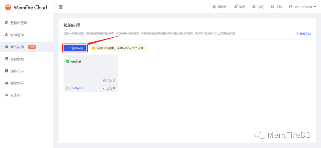 登录MemFire Cloud, 在“我的应用”页面创建一个新应用