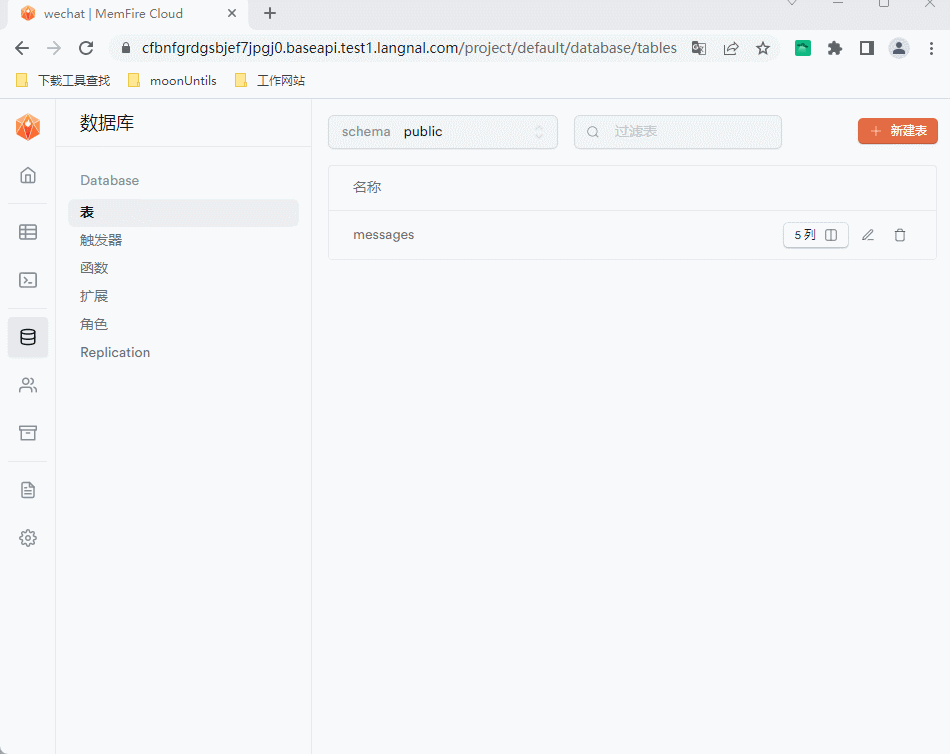 在“表编辑器”页面,点击“新建表”,创建messages表。messages表主要记录用户发送的每一条信息,表结构字段如下: