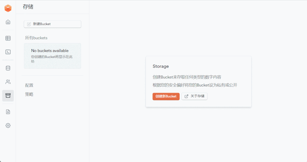 点击‘存储’图标菜单,点击‘创建新bucket’,创建images存储桶
