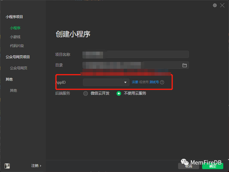 选择目录是下载好的小程序项目的目录,AppID为您在微信公众平台注册小程序获得的专属appid。