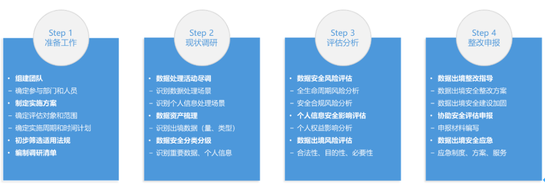 包括:数据处理活动尽调、数据安全分类分级、数据出境安全风险评估、数据出境安全整改指导、安全评估申报、数据出境安全应急等。