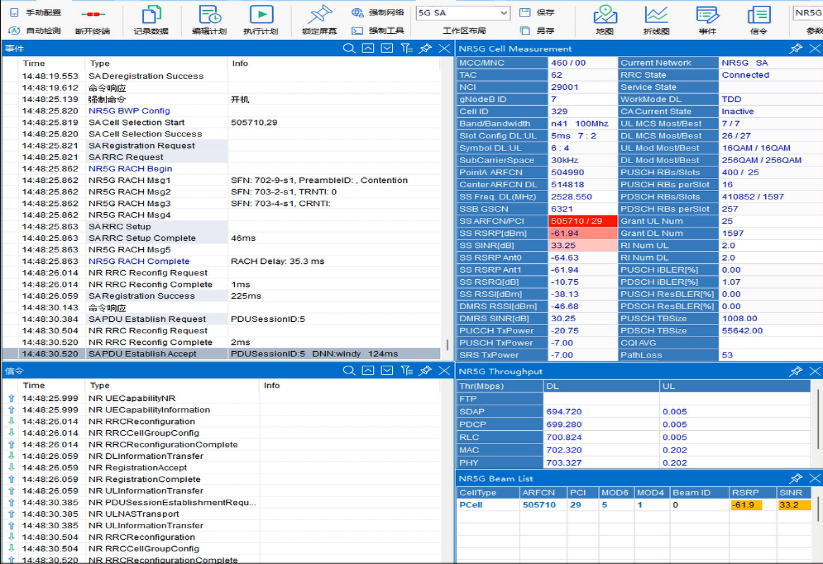 东方国信在中国移动信息港实验室按照相关技术规范进行了产品软件和硬件功能验证,主要包括5G系统内切换、4G/5G异系统互操作、VoNR、EPS Fallback、24小时长保、大容量性能、2T2R单用户下行峰值速率(可达700Mbps)、2T2R单用户上行峰值速率(可达200Mbps)、单用户控制面时延(小于20ms)、用户面时延(小于10ms)、同步精度、功耗以及各种射频测试。东方国信小基站系统在测试过程中展示了其“小身材、高性能”的特点,也验证了比科奇PC802 PHY SoC强大的in-line硬件加速能力。