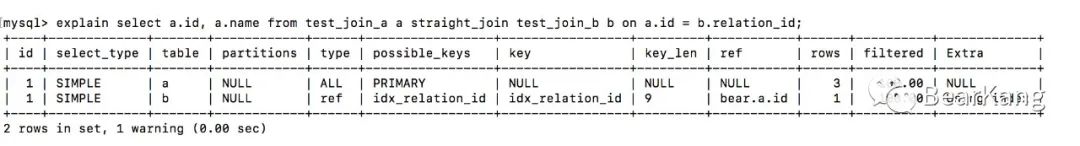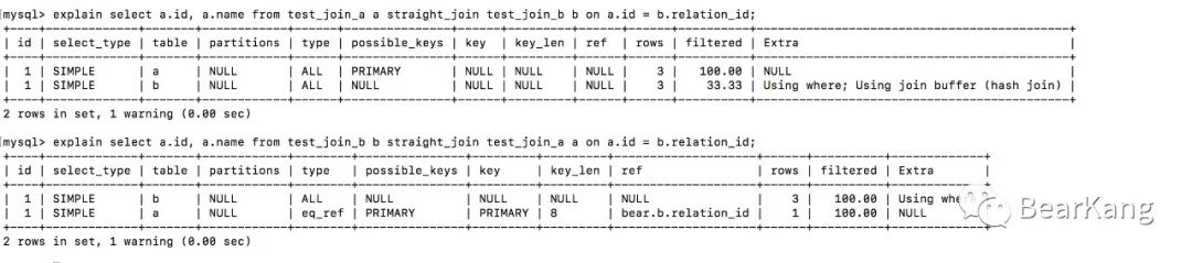 创建如上两个表,表b逻辑关联表a的主键,分别查看表a做驱动表join表b,和表b做驱动表join表a的执行计划,可以发现,表b做驱动表时执行计划明显走了索引,而表a做驱动表时都走了全表扫描,这是因为表b的relation_id字段没有建立索引, 因此在使用a表做驱动表,查询表b的relation_id与a的id相等这一条件时没有可用索引。