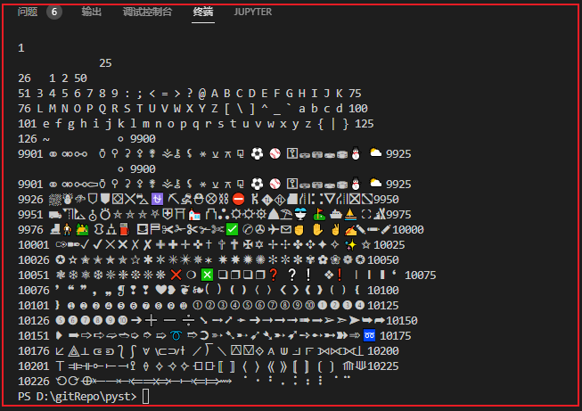 以上图例是在 vscode 中执行的结果,如果在是 cmd 窗口中执行,大部分字符都无法显示。这是因为不同的终端对编码的支持是不一样的。当 unicode 显示在终端或文件中时,它实际经过了编码,比如编码为 utf-8 或 gb2312。而有些编码只在 web 或特殊终端下显示,比如上面带颜色的字符,这些在 notepad 中肯定无法显示,但在 web 页面中是可以显示的。
