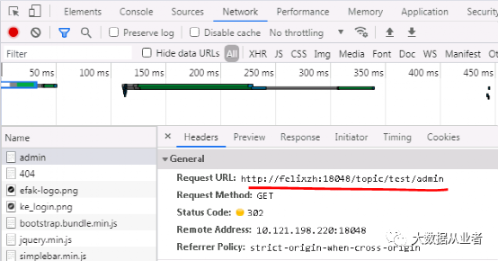 既然不是Admin Token输入错误,而404通常指访问资源URL不存在。经过沟通交流,ISV客户反馈:后台日志未见任何异常信息;Kafka集群确实存在该Topic。这样的话,基本可以排除ISV客户使用问题了,大概率是踩到原生BUG的坑。现场客户反馈之前修改过Admin Token默认值:keadmin改为fsdfds#fdsfs(已虚构,关键是包含#字符)。本地相同版本的开发环境使用包含#字符的Admin Token成功复现404异常。浏览器F12发现删除topic使用的接口竟然是get方法、Admin Token值直接通过url明文传递。那么,问题就一目了然了。如上图所示:使用Admin Token值为admin#123,删除Topic名称为test。访问的请求为get方法,url为http://felixzh:18048/topic/test/admin