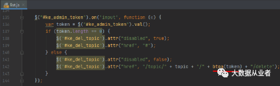 针对该问题解决方法不一。通常用法来说,删除资源一般会使用delete方法,待删除的资源通过Body密文传输。但是,这种改动涉及前端代码稍微多点。最终,决定仍然保持使用原有的get方法,只将Admin Token明文传输改为密文传输。efak-web/src/main/webapp/media/js/main/topic/list.js