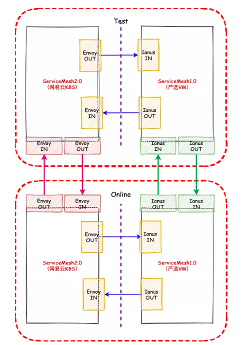 随着 ServiceMesh 从 1.0 向 2.0 演进,过渡期会存在 ServiceMesh1.0(严选 VM)与 ServiceMesh2.0(轻舟 Kubernetes)两种类型的 ServiceMesh 共存的情形,自然面临两个 ServiceMesh 间的流量调拨问题。这里用“云外”代表 ServiceMesh 1.0,“云内”代表 ServiceMesh 2.0。