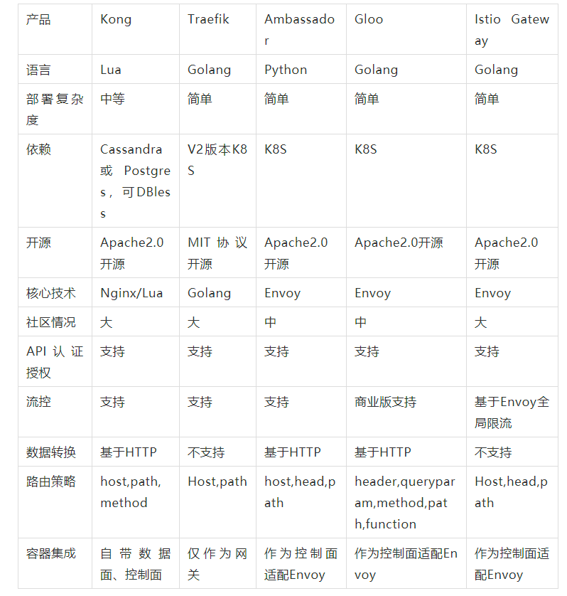 在 API 网关 2.0 阶段,上云之初,严选 API 网关团队也调研对比了 Kong、Traefik、Ambassador、Gloo、Istio Gateway 等的特性,目标是构建一个云原生的 API 网关。
