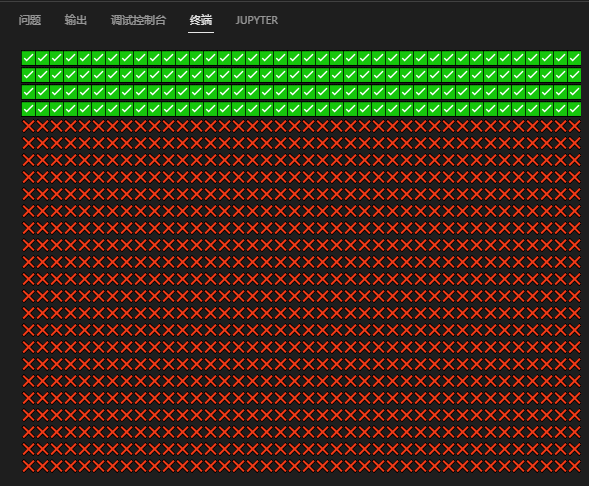 #!python3import timeimport sysdef clean():global Nfor i in range(N):print('\033[A\r', end='')print('❌'*40, end='\r')time.sleep(0.03)sys.stdout.flush()def demo():global bufferfor i in buffer:print(i)time.sleep(0.1)sys.stdout.flush()if __name__ == '__main__':N = 25buffer = []for i in range(N):s = '✅'*40buffer.append(s)print()while True:demo()time.sleep(0.1)clean()