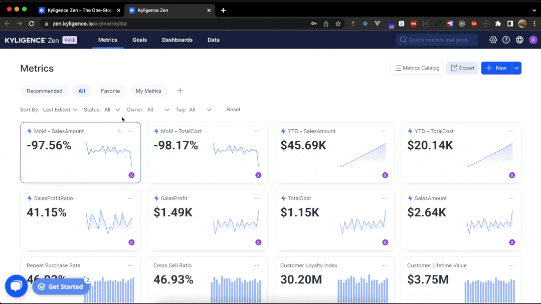 Kyligence Zen 指标平台提供海量指标模板,用户可一键导入行业典型指标,以下指标来自模板“网络商城销售分析指标”,更多模板请访问:zen.kyligence.io。导入指标模板后,即可在指标页面中看到新增的指标。