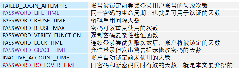 •PASSWORD_ROLLOVER_TIME、PASSWORD_GRACE_TIME、PASSWORD_LIFE_TIME三个资源的缺省设置如下
