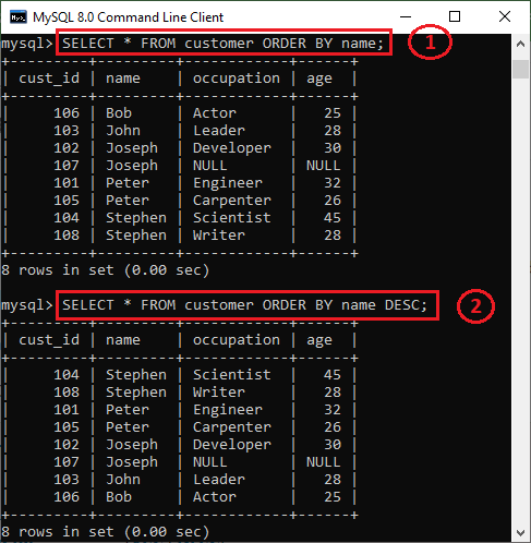 在下面的输出中,可以看到第一个查询将根据 name 列按升序对表数据进行排序。但是,如果通过指定 DESC 关键字运行第二个查询,则表的顺序会按降序更改。