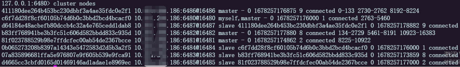 注意:此操作要在6482节点上执行,因为此时槽位还在6482节点上,如果在其他节点执行则会返回(empty array)信息